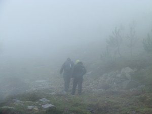 Y qué decir de los esforzados caminantes. Vuelan paraguas y chubasqueros como estandartes rotos por el viento que ronca y empuja como un monstruo de ominosas manos, decidido a no dejarnos hasta que, de pronto, el caprichoso eolo se retira sin más aviso devolviéndonos al silencio y la paz de los campos del Señor.