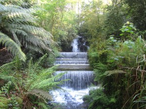 Una amable empleada nos reparte unos folletos y nos abre la cancilla de la zona ajardinada dejándonos en libertad para recorrerla a nuestras anchas. Nuestros asombrados ojos no cesan de maravillarse ante la belleza y variedad que nos rodea. Al paseo entre cientos de camelios, ahora con pocas flores pues la camelia es flor de invierno, le sigue otro a lo largo del río que nos lleva a una espectacular cascada . Encontramos más arriba un increíble paseo de bojes centenarios que nos lleva al estanque de la Bola del Mundo en cuyo borde se alzan dos enormes tulipaneros de Virginia.