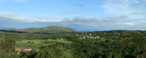 Comenzamos la marcha en la aldea A Cavadosa, siendo la primera imagen con la que nos topamos la fervenza que forma en su bajada al valle O Rego do Porto dos Bois, para ir ganando altura hasta llegar al lugar en donde se eleva la ermita de Santa Mariña, acogotada entre los enormes mástiles de los molinos que no muelen sino giran y giran extendiendo su ronco y monótono fungar sobre el verde y amarillo del monte raso que configura estas alturas.