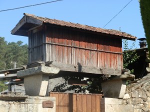 Llegados a Cenlle cuando el sol está bien alto atravesamos sus solitarias callejas. No hay nadie en el exterior, pues el calor aprieta y mejor se están dentro de casa. Llaman la atención las ristras de mazorcas que penden de las paredes de algunos canastros, reflejando el brillante amarillo de sus espigas como granos de oro.