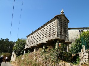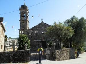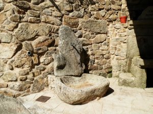 Rego das fervenzas, Regato das Salgueiriñas, Rego da Graña, Fervenza de Lapeal, Rego dos Loureiros… todos secos, apenas un hilo de agua en algunos. Una buena parte del recorrido discurre por la sombra de pinares y de las riberas los ríos y regatos que, aunque con cauces casi vacíos, conservan la sombra de la vegetación ribereña pero no nos libramos de la larguísima corredoira, de más de 3 Km. que hemos de superar en continua ascensión bajo el sol del mediodía, con escasa sombra, sobre las losas irregulares, en las que los carros del país han dejado sus huellas en forma de rodelas, las hendiduras causadas por su paso durante siglos sobre estas piedras centenarias, obra de la ingeniería rural, hoy solamente pisadas por los senderistas.