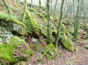 Seguimos caminando por la fresca entre carballeiras, fincas de labor y pinares, a veces por los viejos caminos empedrados en los que los carros del país, antes indispensables en la vida rural y hoy simples objetos de interés etnológico, han dejado sus huellas en las rodelas marcadas en la losas que forman el pavimento en su ir y venir durante siglos.