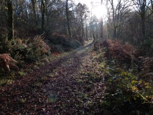 Los rayos del sol vistiendo de oro las hojas de carballos y ameneiros iluminan con la magia del suave atardecer la hermosa corredoira alfombrada con la ocre hojarasca con la que este marchito otoño ha decorado el camino que nos queda, bordeando el río, para regresar a Por de Lapa, inicio y fin de nuestra ruta.