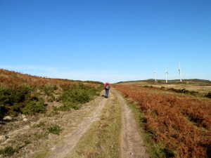 Una vez pasado el Regueiro do Canguiño, a unos 800 m., del punto de partida, acometemos la subida al Alto do Barazal colonizado como casi toda la sierra por los generadores eólicos cuyas aspas, en un día como éste soleado y sin viento, permanecían en calma, sin el sordo ronroneo que es habitual en estos lugares.