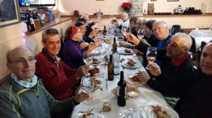 Sigue la ruta por pistas forestales y estrechos senderos, ora por umbríos pinares ora por verdes campas, hasta dar de nuevo con el asfalto que anuncia la proximidad del paisaje urbano con su ruidoso y espeso tráfico del que, de alguna manera,  nos evadimos al tomar el paseo del río Lagares que nos lleva por su orilla hasta las inmediaciones del estadio de Balaídos y desde allí a la calle Florida que es donde se encuentra el restaurante Novo Vidal en cuyo comedor nos espera la mesa bien servida para los catorce comensales que allí nos reunimos con el fin de  celebrar  los doce meses en los que, casi sin interrupción, semana semana, hemos gozado del privilegio de patear todos los caminos que se pusieron a nuestro alcance con lluvia o con sol, con viento o con calma, disfrutando siempre del placer de senderear.