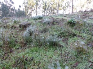 Dejando atrás los silenciosos habitantes del camposanto, pronto nos topamos con las fincas que rodean la parroquia, a estas horas con su brillante hierba mojada y algo de escarcha caminando a lo largo de los encantadores carreiriños que cruzan estos campos hasta adentrarnos en los montes y pinares con alguna carballeira de por medio que pueblan los aledaños de este Vigo rural. No  tardamos en alcanzar el parque forestal de Monte dos Pozos, en la vecina parroquia de Valladares, que cuenta con un magnífico mirador sobre la bahía de Vigo inhabilitado en esta mañana por la espesa niebla.