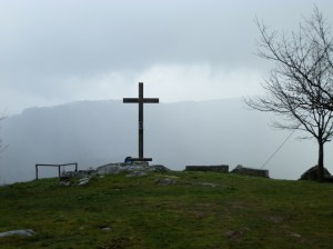 La primera vez que los de Senderando subimos al cerro sobre el que se eleva la cruz del Santo Aparecido fue en 2007. Después volvimos en varias ocasiones con distintos recorridos pero pasando siempre por allí. En este lunes de febrero del 2017 pasábamos de la docena los que, en un día de lluvia y a veces viento, salimos de Xunqueiras, en Pazos de Borbén, y tras una mañana de continua ascensión alcanzamos el promontorio que en los días claros es un espléndido mirador de las tierras de Pazos y Fornelos pero que esta vez era una simple cruz perfilada en un telón de niebla y lluvia detrás del cual no había nada que contemplar.