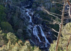 Via Crucis, petos de ánimas y templete con artístico cruceiro además de la casa rectoral completan el conjunto. Bajamos desde allí hasta la capilla de Nº Sª de la Anunciación camino del objetivo principal de esta caminata que es la mencionada cascada a la que accedemos después de caminar un par de kilómetros por la falda del monte entre cuyas estribaciones se encuentra el impresionante escenario que alberga la cascada cuyas aguas se precipitan desde la altura en una vertiginosa cola de caballo bien menguada, como decíamos, por la instalación de la hidroeléctrica que está situada por allí cerca.