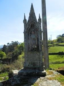 Dejando atrás el puente, toca ahora subir y subir por monte raso casi siempre hasta sobrepasar los 700 m. de altitud y alcanzar, ya en la bajada, el lugar de Cortegada en donde se encuentra una modesta fuente, la de Seixiño, y una curiosa construcción entre peto de ánimas y capilla alzada en un solitario cruce de caminos.