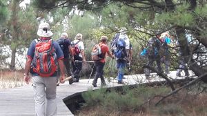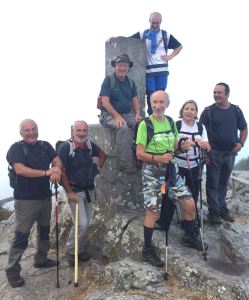 Iniciamos la ascensión en zona urbana hasta la plaza de San Amaro, desde donde ya nuestro camino se adentró en un bosque de pinos, este lunes no era precisamente de sol, una densa niebla iba acompañándonos en nuestra ascensión al Tecla. Un indicador del camino nos anticipó “14 Revoltas”, y efectivamente algunos de nuestros caminantes iban contándolas y cantándolas para dar ánimo a los más rezagados.