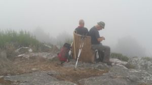 La ermita de Santa Tecla nos recibió envuelta en niebla, lo que hacía más misterioso el entorno, aunque es cierto que no apreciamos nada del maravilloso paisaje, nuestros ojos lo intuían al ya conocerlo. Nos cruzamos con algunos turistas, decepcionados por no poderlo apreciar. Desde allí iniciamos el descenso por la cara oeste del monte, entre nubes y niebla, al fondo tuvimos oportunidad de vislumbrar el perfil de A Guarda.