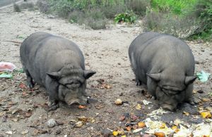 Bordeamos el monte en dirección sureste por el lugar de Salgueiro, hasta llegar a playa de Do Muiño y posteriormente a la de Camposancos, al final de esta a todos nos llamó la atención una gran finca cerrada, con vistas espléndidas, habitada por una familia de cerdos vitnamitas, se estaban dandose un festín con restos de comida de algún restaurante próximo.