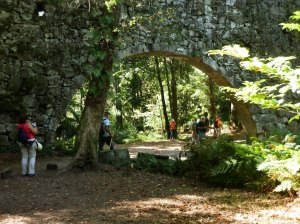 Seguimos hacia el interior pasando por Bon de Arriba y Bon de Abaixo hasta alcanzar, después de un par de kilómetros de monótono asfalto, el parque industrial de A Castiñeira recuperando de nuevo los viejos caminos y corredoiras que nos llevan hasta el lugar de Piñeiro desde donde bajamos a la Finca de Frendoal o Leira dos Condes también llamada el Bosque Encantado que, debido al abandono y suciedad, ha perdido buena parte de su pretendido encanto. Lo cruza el Arco de la Condesa, un imponente acueducto de piedra entre la espesa vegetación entre la que se desliza, casi invisible, el río Orxa, cuyo cauce casi seco entristece todavía más tan abandonado paraje.