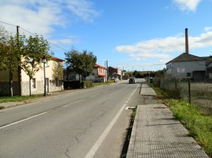 Sigue la ruta, siempre entre grandes extensiones de hierba o de maíz ahora segado, sin cuestas ni rampas abruptas, siempre por pista limpia y seca, como de paseo, hasta el centro de Visantoña, unas cuantas edificaciones a ambos lados de la carretera entre las que destacan las enormes naves de una antigua cerámica cuya actividad cesó en 1970.