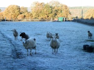 Los campos pintan blancos por la helada y de ello se quejan las ovejas de algunos rebaños que salen a nuestro paso y a las que el hielo les impide pastar.