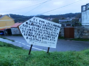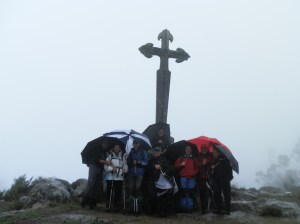 Sopla el viento con fuerza obligándonos a manejar con habilidad los paraguas para mantenerlos derechos mientras iniciamos el descenso entre chubascos intermitentes, cada vez más intensos, hasta tocar el Corredor do Morrazo bajo cuyo viaducto pasamos para toparnos con la ermita de San Cosme desde donde comienza otra subida a la Cruz de Hermelo, una pétrea cruz de Santiago que se eleva sobre el Monte da Esculca, ya en el municipio de Bueu.