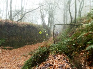 Los ocres de la hojarasca que cubre los caminos, los verdes oscuros y los verdes claros de los helechos, las anémonas, las digitales que en este tiempo invernal esconden sus colores, brillan bajo la lluvia y sus pequeñas hojas tiemblan como encogidas por el viento que a su vez ruge entre las copas de los castaños, los robles, los abedules y los pinos mientras que estos aguerridos caminantes tantean con cuidado donde ponen los pies, trastabillando a veces sobre las resbaladizas rocas, patinando en el mojado suelo de los carreiriños que serpentean a lo ancho y largo de la fraga.
