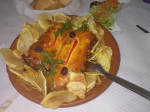 Ya nos vamos acercando a los 20 Km. cuando entramos en Toén, la cabeza del municipio que ampara a las citadas poblaciones y en cuyo centro se halla el restaurante Grancas, especializado en comida obrera y eso se nota en el menú. Plato único: lentejas y bisté con patatas fritas. Las primeras bien, sabrosas y contundentes con sus trocitos de tocino, lo segundo recordaba a Chaplín en «La quimera del oro», intentando disfrazar el hambre con un par de suelas de zapato.