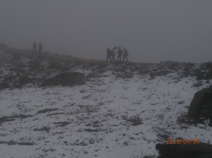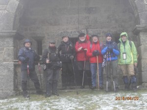 A medida que ascendemos más blanco es el paisaje. Alcanzados ya los 1.000 m. de altitud un pedrusco nos informa de que en ese punto se encuentra el nacimiento del río Tea, unas pozas de donde brotan sus primeras aguas. Una densa niebla nos envuelve mientras seguimos monte arriba hasta dar con el Coto da Pía a 1.530 m. y un poco más adelante con la cima del Faro de Avión. Casi ocultos por la niebla cientos de aerogeneradores nos avisan de su presencia con el sordo rumor de sus aspas, como fantasmas redivivos de los manchegos gigantes del Quijote.