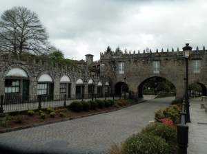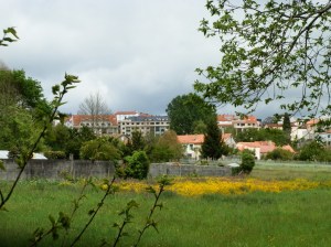 Intentamos seguir por la orilla del río pero la hierba de los campos que lo bordean, demasiado alta y mojada, nos empapaba como si lloviera por lo que decidimos seguir por pistas y algo de carretera hasta dar con el casco urbano de Negreira en donde se encuentra el mesón Os Arcos cuyo menú del día, a base de croquetas y arroz de marisco entre otras opciones, sirve para silenciar la protesta de nuestras tripas que ya iban exigiendo algo de atención.