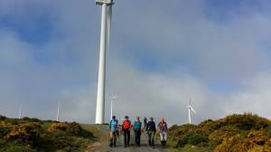 Continuamos cara ao sur en dirección ao Parque Eólico do Monte Seixo, que alcanzamos despois dunha boa subida por pistas forestais durante seis quilómetros e medio. Non chove, pero hai bastante néboa, polo que a temperatura é baixa.