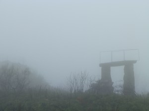 Desde el primer mirador que alcanzamos en las alturas de esta sierra aún podemos disfrutar de la vista de la costa rocosa contra la que baten incesantes las olas rebosantes de blanca espuma pero, a medida que avanzamos por los pinares que pueblan estos montes, la niebla se va cerrando y cuando llegamos al otro mirador, el que está cerca del campo de tiro de A Cruz da Portela, ni el mar ni el cielo ni la costa on visibles. Una pena, porque las vistas desde ese sitio en los días despejados son espectaculares.