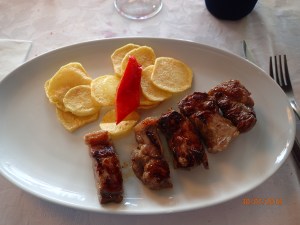 Las mesa muy bien puesta, con elegante mantel de lino sobre el que nos van sirviendo brochetas de rape, tacos de ternera, solomillo a la pimienta, revueltos varios y un etcetera de deliciosos platos y postres, todo por el módico precio del menú del día. No es de extrañar que el comedor estuviese a rebosar.