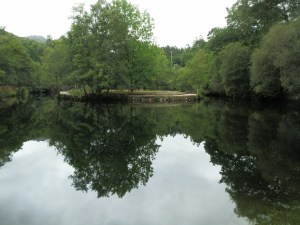 Después de atravesar los pinares que rodean el lugar de Corquillón, un conjunto de casas casi perdido en el municipio de Covelo, bajamos hasta cerca de la ribera izquierda del río Tea que fluye paralelo a la ruta que, entre carballeiras y fincas de labor, por caminos de carro, corredoiras y congostras, nos lleva hasta los Pasos de Lourido por los que atravesamos el río.