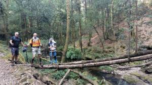 Para llegar hasta allí habíamos partido del torreiro de Mouriscados, una parroquia mondaricense por la que fluye el Xabriña en un tramo jalonado por muiños, casi todos restaurados, que han dado lugar a una preciosa ruta que, siguiendo el curso del río, lleva al caminante por hermosos parajes plenos de verdor y frescura en una día como éste de calor canicular que apenas si se deja notar entre su espesa arboleda de ribera.