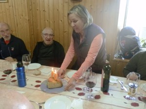 Desde ahí comienza el descenso hasta el valle en el que se asienta Montillón de Arriba cuyo atractivo más interesante en Casa Verdura, bien conocida por estos senderistas por su espléndido cocido, aunque en esta ocasión nos hubimos de contentar con una agradable sopa de fideos y un estofado de ternera que nos dejaron satisfechos. Los vinos, riojas y mencías, de alto rango, fueron invitación de nuestra querida andarina y compañera de fatigas Mari Carmen que así celebraba su cumpleaños tan lozana y alegre que parece que los años no pasan por ella.