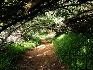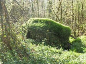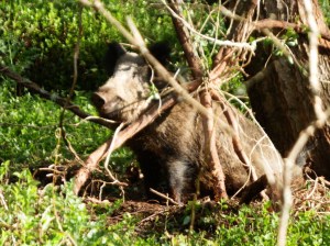 La senda de pescadores por la que caminamos es una auténtica gozada. Siempre acompañados por el rumor de las aguas del Miño que bajan rápidas y bordeadas de espuma entre los imponentes muros de las pesqueiras, ora por estrechos carreiriños entre tupidas alfombras vegetales de un verde intenso, ora por el borde el río bajo los imponentes árboles de la floresta ribereña, disfrutamos a tope de una mañana espléndida en la que los rayos del sol iluminan nuestra marcha en la que no faltan las sorpresas como la de aquel jabalí atrapado en el tronco de un eucalipto y la del tren que pasa como una exhalación mientras caminamos a su vera, muy cerca de la orilla.