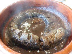 Después del aperitivo en su bodega a base de jamón y vino del Condado, subimos al comedor en donde nos espera la deliciosa empanada y salpicón de lamprea seca como entrantes del plato principal, la tradicional lamprea a la bordelesa, que algunos comensales sustituyen por un sabroso cabrito, pues la lamprea es manjar que a unos seduce y a otros, los menos, repele.