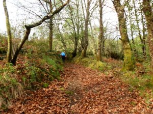 Crepita la lluvia sobre paraguas y chubasqueros, se encharcan los caminos, chapotean las botas, surge la niebla mientras, abandonado el río, después de haber pasado por A Quinta y San Xoan de Monte Redondo, rodeamos el cerro en el que se eleva capilla de San Miguel ya cerca del Bar San Mauro en el que, como únicos comensales de su modesto comedor, reponemos fuerzas a base de ensaladilla y costilletas de ternera acompañadas de mencía del Bierzo rematando el ágape con tarta de manzana, licores e infusiones.