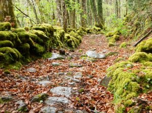 Los sonidos del bosque, los trinos de las aves, la suave caricia del viento, la música del agua en esta mañana de temperatura suave y cielo franco nos envuelven en la magia de estos sitios hasta que aparecen las nubes grises, casi negras. Caen unas gotas finas, gruesas, más gruesas, un aguacero que nos coge casi de sorpresa.