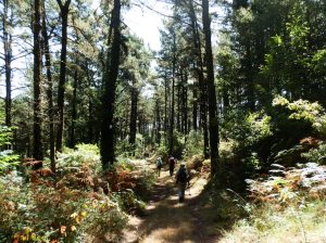 Ya en pleno descenso, anchos caminos tapizados de verde hierba nos llevan entre frondosos pinares hasta el lugar de San Roque en la parroquia de Salcidos, muy cerca de la iglesia de San Lorenzo que es donde se encuentra el restaurante en donde nos detenemos para descansar y degustar su menú del día a base de pimientos rellenos, lubina a la plancha y tarta de piña entre otras especialidades que nos permiten recuperar las energías gastadas durante la jornada matutina y que buena falta nos harán para la de la tarde.