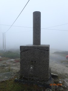 Sigue la ascensión entre niebla y viento hasta dar con los primeros generadores eólicos y el poste de televisión próximos al vértice geodésiso que nos indica que estamos en el punto más alto del monte Xiabre. Desde allí se contempla, aún difusa, la panorámica de ría de Arousa que un poco más abajo, disipada la niebla, podemos admirar con claridad.