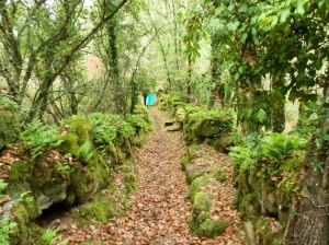 Seguimos entre carballeiras y caminos rurales pasando por el lugar de Os Outeiros hasta llegar a la parroquia de Rante desde cuya iglesia nos dirigimos al camino que toma aquí el nombre de Senda de A Boutureira en una de sus variantes.