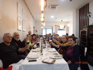 No lejos de allí, atravesamos el río y llegamos a la Parrillada O Bo Xantar, donde reponemos fuerzas. Con un menú de 9 € muy digno, previamente acompañado por una bebida y unos muy abundantes entrantes de empanada y jamón serrano. La comida estuvo acompañada de unas botellas de buen Rioja con las que nuestro compañero Humberto tuvo a bien obsequiarnos por el día de su cumpleaños, como por otra parte es preceptivo en esta asociación.