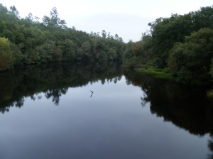 Acometemos el río Lérez por su parte urbana, por donde su amplio cauce entra en la capital pontevedresa. Dejamos atrás el parque y la playa fluvial para continuar por el sendero de pescadores que bordea su orilla derecha. Sus mansas aguas fluyen lentas y solemnes interrumpidas por los espesos muros que, aquí y allá, contienen sus aguas para liberarlas en anchas barreras de blanca espuma.