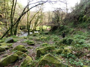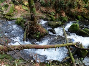 Hay que caminar unos cientos de metros por el paseo del Lagares y desviarse un poco después de pasar por el polígono de Miraflores. Seguimos un rato más entre naves industriales para abandonar el asfalto y encaminar la ruta por un sendero que nos lleva por los aledaños del Monde da Serra hasta las orillas del Rego da Barxa que en estos días de lluvias y borrascas baja encajonado en la vaguada con su cauce rebosante de agua, espuma y energía entre la frondosa arboleda, a la sombra de las altas acacias que filtran la luz de la mañana arrojando un sombra semioscura sobre las aguas del río que bajan alborotadas y brillantes como ondulantes láminas de bruñido acero.