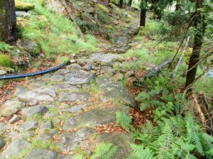 El tramo inicial es una larga y pronunciada subida por un camino empedrado en el que se pueden ver las rodelas o huellas que a lo largo de los siglos han ido dejando los carros del país.