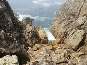 Poco después de pasada la iglesia de Santa María de Caamaño, no tardamos en llegar a la pista que nos lleva por el borde del mar hasta el mirador de A Illa do Mar desde donde se disfruta de la bellísima estampa que ofrecen las olas de un intenso azul festoneadas por los rizos de blanca espuma acariciando las oscuras rocas.