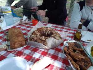 Y de su propia despensa nos obsequió con unos ricos dados de leche frita.Todo esto degustado a la sombra de los pinos y carballos del merendero de Chan da Lagoa. Hubo colaboraciones como las tortillas de Juan y Moisés, la ensalada de Torres, el roscón de Antón y el apflestrudel de Dietmar. Todo eso acompañado por un Ribera del Duero con el que brindamos porque nuestra Elvira cumpla y cumpla sin que los años pasen por ella.