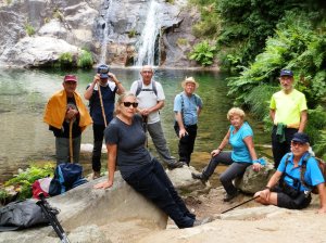 Allí tuvo fin y comienzo la ruta de este lunes que transcurrió casi en su totalidad por los pinares de la sierra. Una ruta en forma de uve que baja desde las alturas de San Cosme hasta el fondo de la vaguada en cuyo vértice se desploma la fervenza de A Cola de cabalo, con la que O Rego das Pías se desmelena antes de que llegue la sequía estival.