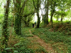 Pasamos de refilón por la villa para seguir monte arriba hasta la capilla de San Roque, antesala de la iglesia parroquial de Morgadáns. Atravesamos el pueblo subiendo hasta O Pombeiro, un espacio creado por el que fue conocido y algo extravagante pintor San Luís que tenía estudio y exposición permanente en la calle del Príncipe, en Vigo. Lemas de paz y amor llaman la atención en los muros que rodean el sitio.
