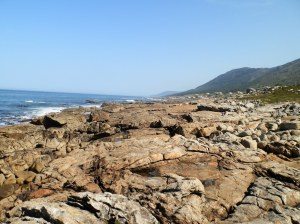 Como en otras ocasiones, nos hemos hemos decidido abandonar la pista por la que discurre el camino de Santiago y continuar nuestra marcha por encima de las enormes piedras que se extienden desde el monte hasta el mar aprovechando la marea baja que deja al descubierto esas inmensas losas que, combinadas con otras rocas más pequeñas, dificultan la marcha por tan irregular sendero que pone a prueba nuestras rodillas y nuestra agilidad, ya que es fácil resbalar y darse un buen porrazo.