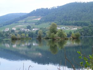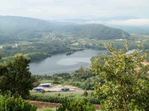 A poco de abandonar los dominios del hotel, un estrecho sendero nos mete por una frondosa carballeira pasando después por umbríos pinares de los que salimos al monte raso que, en continuo ascenso, nos lleva por pistas forestales que discurren por la ladera, cada vez más arriba pero siempre con la estampa del río Miño embalsado allá abajo cuyas aguas parecen quietas como un enorme espejo gris plateado que se extiende a los pies e la parroquia de Barbantes hasta donde la vista alcanza.