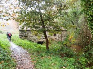 Después de un poco más de 2 Km. entre el río y la vía del tren atravesamos ésta por los aledaños del lugar de Oleiros para desviarnos por la Senda del río Mendo o Lobeira en sentido contrario a su desembocadura en el Miño, por aquí cerca, a nuestras espaldas.