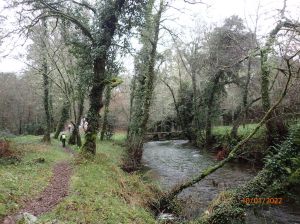 Continúa la caminata monte arriba entre viejos muiños y frondosa arboleda, en continua ascensión, hasta el lugar de Arosa desde donde desciende hasta el de Paradivas, ya cerca de la presa de A Baxe que todos los veranos aparece teñida de verde por un alga tóxica y que, en contra de lo previsto, no evita las inundaciones que provoca el río Umia en sus crecidas a su paso por la villa.