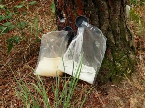 Hay una pequeña diferencia en el procedimiento para la extracción de la resina: mientras que los portugueses practican una pequeña incisión en el árbol con un machete especial grapando la bolsa en su base, los de Goián introducen en el pino una especie de válvula de plástico de la que cuelga la bolsa y por la que gotea la resina.